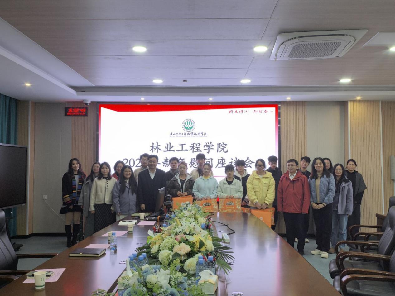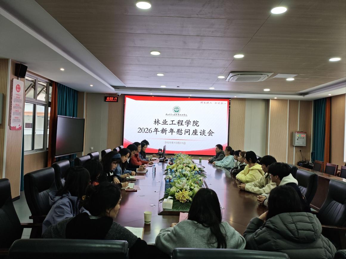2025年12月31日,林业工程学院在学院201党员活动室举行2026年新年慰问座谈会。学院院长黎良财、副院长周泽建和冷毕丹、全体辅导员及在校学生代表欢聚一堂,共叙师生情谊,共话成长发展,共同迎接2026年新年的到来。座谈会由学院学生科科长黄春萍主持。